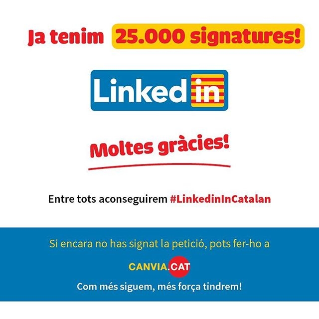 Aprofitant la compra de Linkedin per part de Microsoft, l'ONG del català s'ha posat en contacte amb la multinacional americana per reclamar que la seva nova adquisició incorpori el català com a llengua de navegació i per fer currículums. Com s'explica en el text, "Linkedin ja permet navegar en 23 llengües diferents, com també permet de crear currículums en un total de 43 llengües, i algunes d'aquestes llengües, com el danès, el noruec, l'islandès o el letó, entre d'altres, tenen menys parlants que el català, una llengua que actualment parlen més de deu milions de persones".