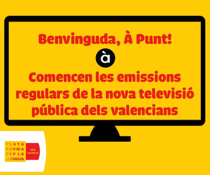À Punt, la flamant televisió valenciana, fa goig. És el moment dels valencians en positiu. Molta gent s'ha sentit reconfortada els primers dies d'emissió del nou mitjà. Escoltar les notícies en la nostra llengua ha estat com una elemental restitució de drets, a la llengua i al nostre punt de vista. Veure com als xiquets se'ls il·lumina la cara amb els dibuixos en valencià és un signe commovedor d'una necessitat lingüística bàsica recuperada.