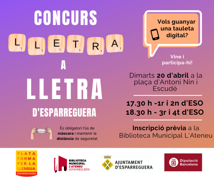 La setena edició del concurs "Lletra a Lletra" es durà a terme a Esparreguera el 20 d'abril a la plaça d'Antoni Nin i Escudé. El concurs consisteix a lletrejar correctament, lletra a lletra, un seguit de paraules proposades, en diverses rondes, amb l'objectiu de fomentar l'interès per la llengua a través del joc.