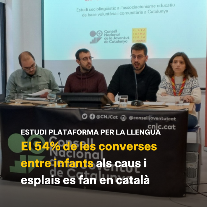 De cada dues converses entre infants als caus i esplais de Catalunya, només una es produeix en català. Aquesta és una de les principals conclusions que s'extreu de l'estudi de Plataforma per la Llengua i el Consell Nacional de la Joventut de Catalunya (CNJC) L'estat del català al cau i a l'esplai. Estudi sociolingüístic a l'associacionisme educatiu de base voluntària i comunitària a Catalunya, encarregat per la plataforma d'entitats juvenils i que ha estat presentat avui en roda de premsa.