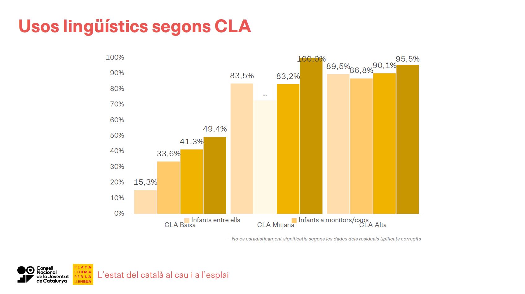 Pel que fa a la repercussió de la condició lingüística ambiental (d'ara endavant CLA), s'observa una clara diferència en l'ús del català entre els caus i esplais de CLA baixa, per un costat, i els de CLA mitjana i alta, per l'altre. En els primers, la llengua de les converses quan hi participa algun infant no arriba, en cap cas, al 50% en català; cal destacar, a més, que només el 15,3% de les converses entre els infants eren en aquesta llengua. A nivell qualitatiu, el perfil més destacat en les tres CLA és el dels infants que canvien del català al castellà, tot i que aquesta tendència té més presència allà on hi ha més catalanoparlants, és a dir, als caus i esplais de CLA alta. Pel que fa als monitors i caps, però, veiem que en els centres de CLA baixa tenen un nivell de conscienciació del seu rol més elevada que no pas els de CLA mitjana i alta.