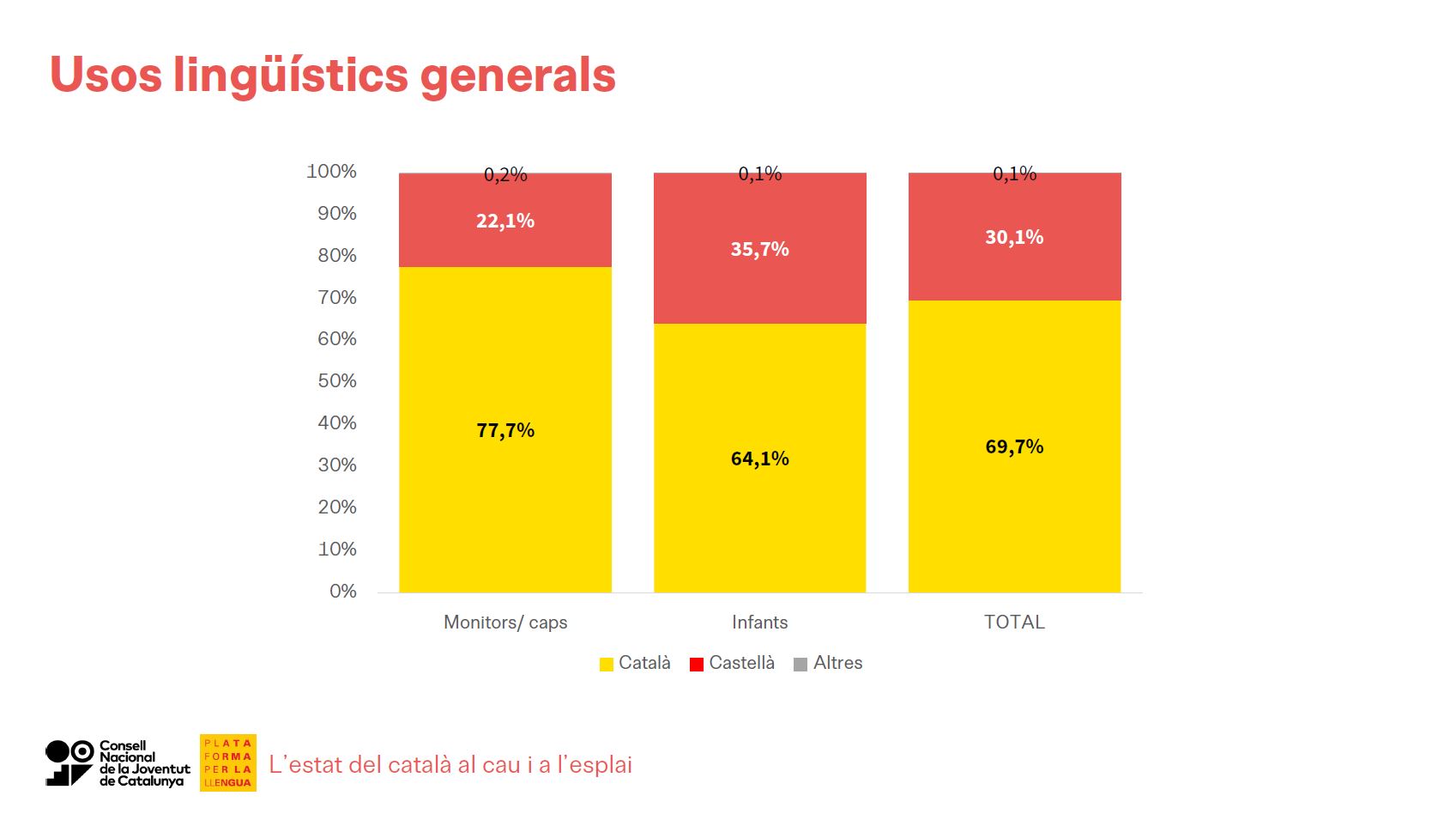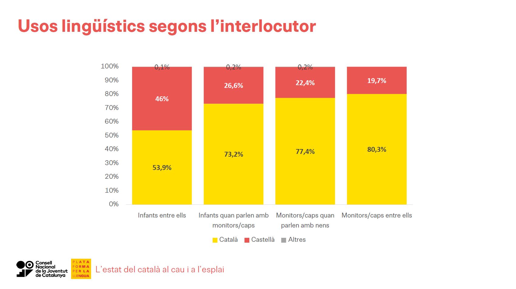 Concretament, un 54% de les converses en què participen només infants (sense intervenció de caps o monitors) són en català. La resta es produeixen majoritàriament en castellà, mentre que una part molt residual es dona en altres llengües. En canvi, quan els infants s'adrecen als monitors o caps ho fan en català en un 73% de les converses. A més, l'estudi ha observat en diverses situacions per part dels infants canvis del català al castellà com un patró de comportament força repetit durant les converses.