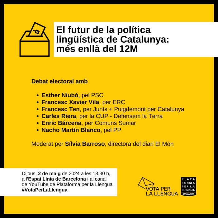 Plataforma per la Llengua organitza aquest dijous, 2 de maig, a les 18.30 h un debat electoral sobre les propostes de llengua dels partits polítics per a les eleccions catalanes del 12 de maig a Catalunya. El debat es farà a l'Espai Línia, a la Dreta de l'Eixample de Barcelona, i comptarà amb les intervencions d'Esther Niubó (PSC), Francesc Xavier Vila (ERC), Francesc Ten (Junts + Puigdemont per Catalunya), Carles Riera (CUP - Defensem la Terra), Enric Bárcena (Comuns Sumar) i Nacho Martín Blanco (PP). Moderat per la periodista Sílvia Barroso, directora del diari digital El Món, el debat es podrà seguir en directe a través del canal de YouTube de l'entitat, i qui vulgui assistir-hi presencialment, s'haurà de registrar a través del web.