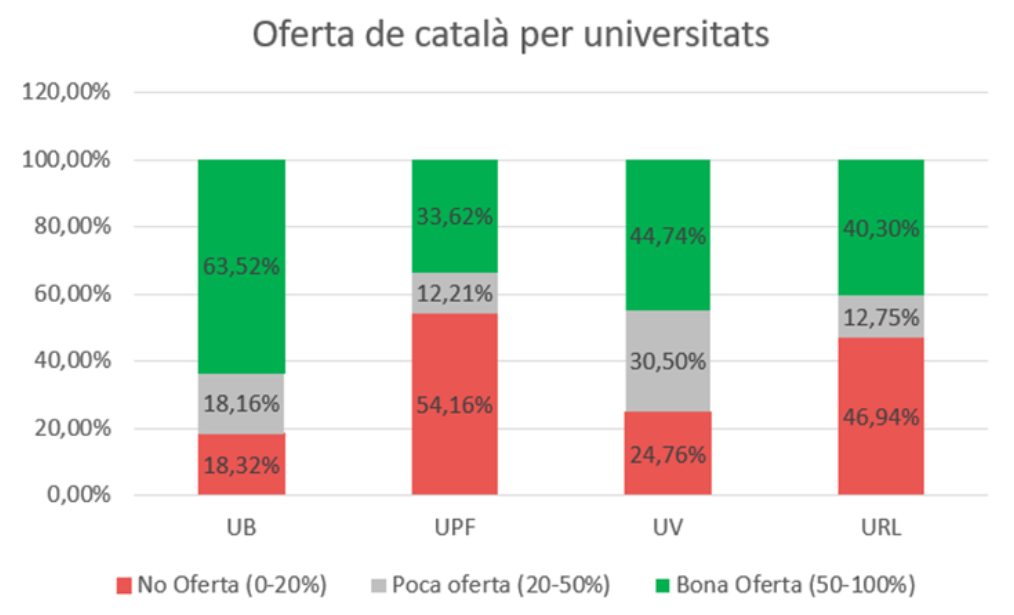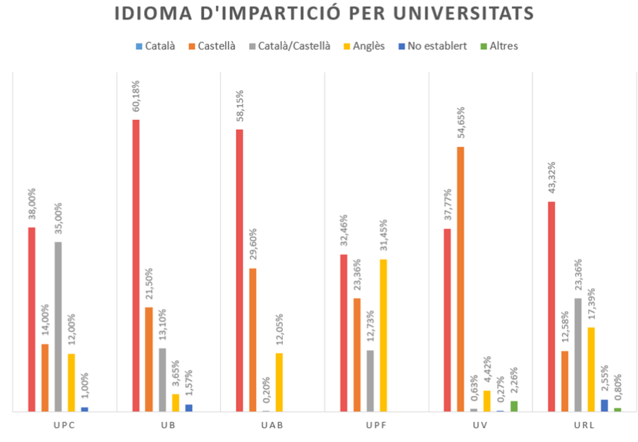 Pel que fa a les universitats, la UB i la UAB són les que tenen més percentatge de grups en català; la UV destaca per una elevadíssima presència del castellà; la UPF, per la gran presència de l'anglès, i la UPC, pel gran nombre de grups que s'anuncien amb la fórmula "català/castellà". En el cas de la URL, en gairebé una quarta part dels grups no s'estableix en quin idioma s'impartirà la classe, malgrat que ho ha anat corregint quan l'entitat s'hi ha posat en contacte.
