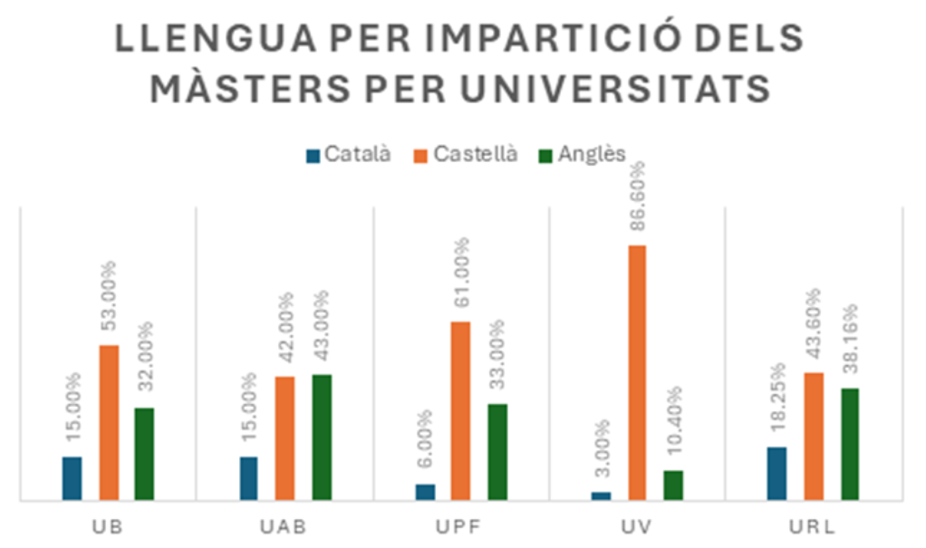 Pel que fa a les assignatures dels màsters de les universitats estudiades, només un 11,45 % es fan en català, mentre que el 57,24 % de les assignatures es fan en castellà, i un 31,31 %, en anglès. Si s'analitza per facultats, es pot veure que en la majoria d'universitats, el procés d'internacionalització mira cap a un públic castellanoparlant i el principal damnificat d'això és el català. A universitats com la UPF o la UV, l'oferta de català és anecdòtica: un 6 % i un 3 %, respectivament. A la UB i la UAB se situa al 15 % en els dos casos, malgrat que a la UAB el castellà es troba en igualtat amb l'anglès mentre que a la UB hi ha 15 punts percentuals més de castellà que d'anglès. La URL és la universitat que fa més màsters en català, tot i que és només el 18 % del total, mentre que l'oferta de màsters en castellà se situa vora el 44 %.