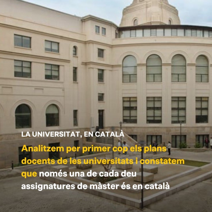 Plataforma per la Llengua ha analitzat, per primera vegada, la llengua en què s'imparteixen les assignatures d'una mostra representativa de sis universitats del domini lingüístic segons els seus plans docents, i ha constatat que la situació és encara pitjor que la que s'havia fet pública fins ara. En el cas dels graus, un 44,98 % dels grups són en català i només un 45,55 % de les assignatures tenen una bona oferta de grups en català. En el cas dels màsters, la situació és encara més greu i només una de cada deu assignatures (concretament, l'11,45 %) es fan en català. L'entitat ha comprovat que en la internacionalització de les universitats l'anglès no és el que guanya més pes, sinó el castellà, i lamenta que en molts casos (més d'un 15 % dels grups) no s'anunciï de manera clara la llengua d'impartició, fet contrari a la LOSU, la Llei orgànica del sistema universitari.