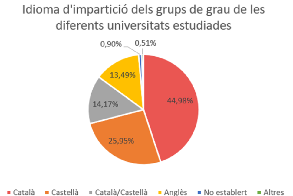 En el cas dels graus, l'estudi de Plataforma per la Llengua revela que, en conjunt, un 44,98 % dels grups dels graus s'ofereixen en català, un 25,95 % en castellà i un 13,49 % en anglès. Tot i la preeminència del català, hi ha un 14,17 % de grups en què la llengua s'anuncia de manera imprecisa i gairebé un 1 % en què no s'anuncia en quin idioma es faran les classes. Tots dos factors van en contra de l'article 33c de la LOSU, que fixa que l'estudiant "té dret a conèixer els plans docents de les assignatures en les quals preveu matricular-se i a ser informat de la llengua d'impartició".