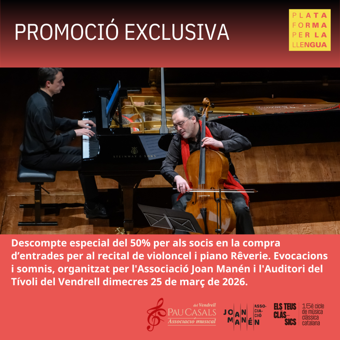 Si ets soci de Plataforma per la Llengua i vols beneficiar-te del preu especial en la compra d'entrades per a aquest recital, envia un correu electrònic a promocions@plataforma-llengua.cat o truca al telèfon 933 211 803 i et facilitarem el codi promocional que cal afegir en la compra d'entrades, seguint l'enllaç: REVERIE, EVOCACIONS I SOMNIS - Associació Musical Pau Casals del Vendrell.