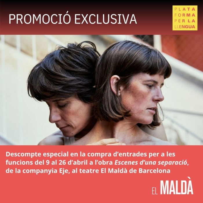 El Maldà ofereix a tots els socis de Plataforma per la Llengua un descompte especial del 9 al 26 d'abril de 2 € per entrada a l'obra Escenes d'una separació, un espectacle de la companyia El Eje, a partir de Secrets d'un matrimoni, d'Ingmar Bergman