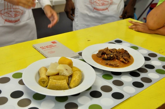El taller va començar a les dotze del matí i els assistents van participar en l'elaboració de la recepta que va preparar un voluntari del programa Volutariat per la Llengua que la Plataforma dinamitza. Es tracta d'un plat típic del Camerun: carn de vedella amb una salsa de cacauets, acompanyat de patates i plàtan. Els alumnes van conèixer de primera mà el nom dels ingredients, la manera de combinar-los en la recepta i curiositats lingüístiques del Camerun.
