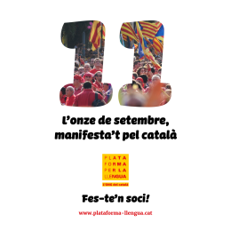 A les 9 h, a Barcelona, diversos membres de la junta executiva de la Plataforma per la Llengua i voluntaris de l'entitat participaran en l'ofrena floral al monument de Rafael Casanova. A la tarda participarem, un cop més, en la manifestació multitudinària per la República. Omplirem la Diagonal! Si encara no us hi heu inscrit, podeu fer-ho aquí:https://diada.assemblea.cat/.