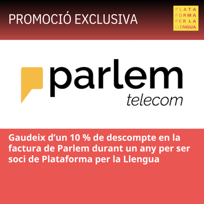La Plataforma per la Llengua i Parlem, l'operadora de telecomunicacions de Catalunya, han renovat un acord perquè els socis de l'ONG del català us pugueu seguir beneficiant de descomptes
