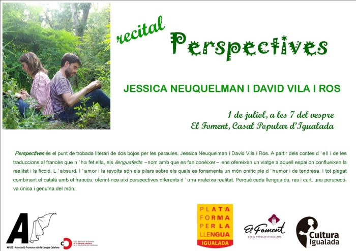 El Foment Casal Popular d'Igualada acollirà el pròxim dijous primer de juliol a les 19 h una sessió del recital "Perspectives", organitzat per l'Aplec en col·laboració amb la Plataforma per la Llengua Igualada, El Foment i Cultura Igualada.