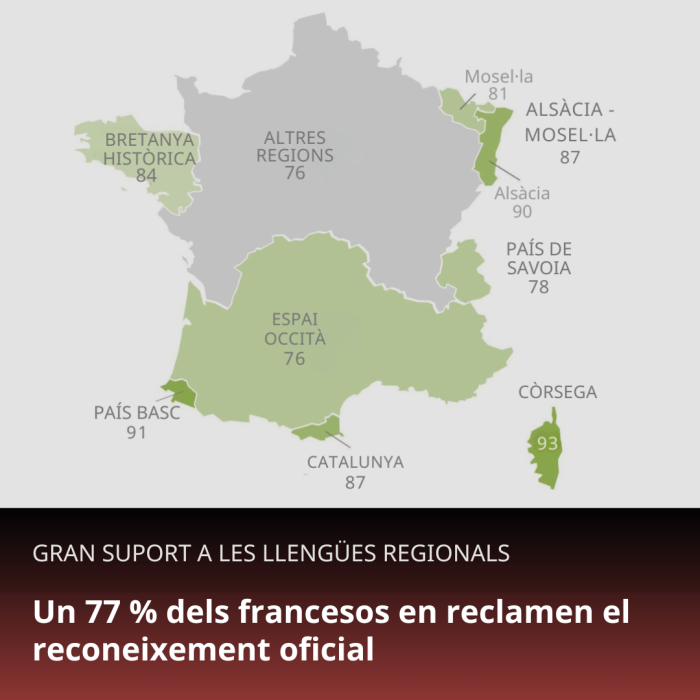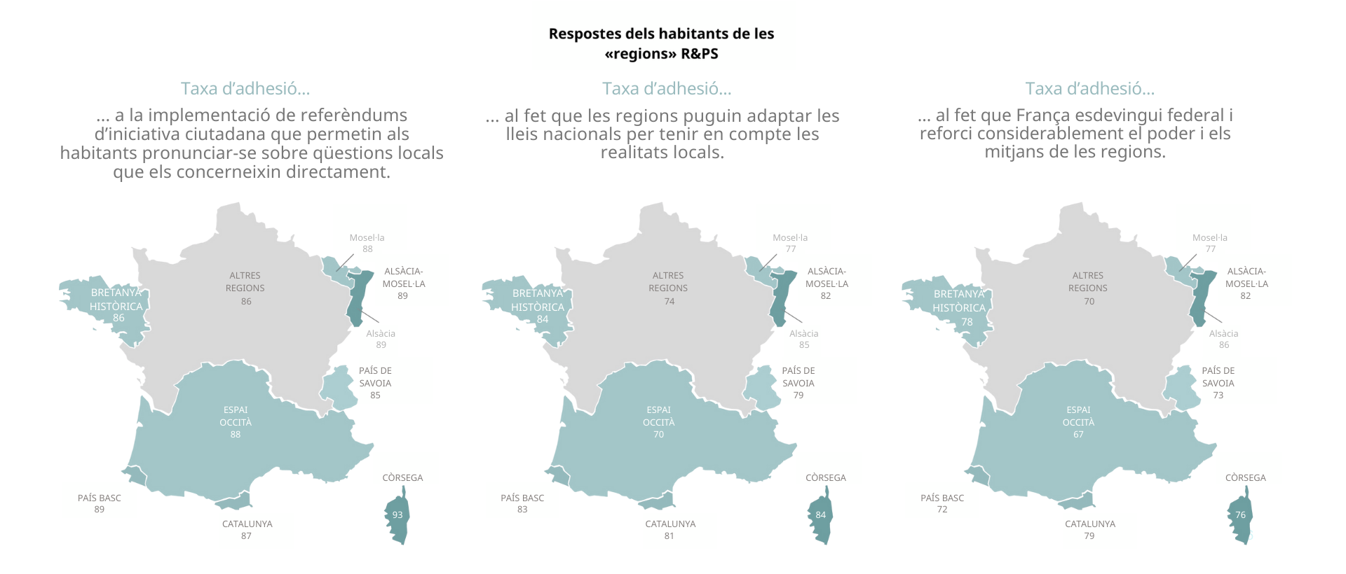 Les dades mostren que aquestes reivindicacions no són exclusives de la Catalunya Nord. A escala estatal, el 68 % dels francesos consideren que les col·lectivitats locals tenen massa poc poder, i el 73 % és favorable a adaptar les lleis a les realitats dels territoris. També hi ha un suport creixent a la diversitat lingüística: el 77 % dels ciutadans (un 81 %, en el cas dels joves de 18 a 24 anys) defensen el reconeixement oficial de les llengües dites regionals.