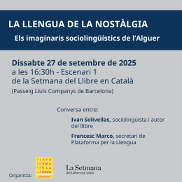 Plataforma per la Llengua consolida la seva participació en la Setmana del Llibre en Català , que té lloc al Passeig Lluís Companys de Barcelona, amb l'organització d'un acte dedicat a la promoció i reflexió sobre l'ús de la llengua catalana. Enguany, l'entitat oferirà una conversa sobre la vitalitat del català a l'Alguer a partir del llibre La llengua de la nostàlgia (Tirant lo Blanch, 2025), una investigació recent del sociolingüista Ivan Solivellas.