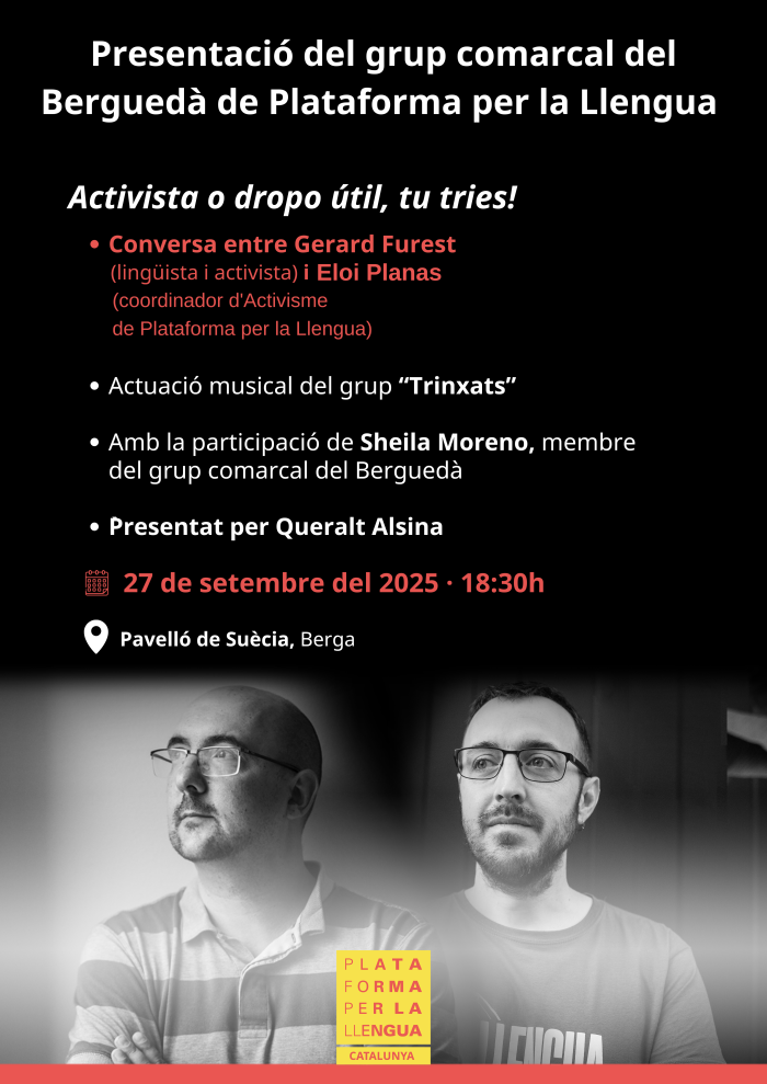La presentació d'aquest grup serà dissabte 27 de setembre, a les 18.30 h, al Pavelló de Suècia de Berga. El contingut central de l'acte serà la xerrada anomenada "Activista o dropo útil, tu tries!", que anirà a càrrec d'Eloi Planas, coordinador d'Activisme de Plataforma per la Llengua, i de Gerard Furest, lingüista i activista. Planas i Furest oferiran una visió crítica i motivadora sobre el paper que cadascú pot tenir en la defensa de la llengua. Per concloure la jornada, presentada per Queralt Alsina, professora de la Universitat de Manresa, hi haurà una petita actuació musical del grup berguedà Els Trinxats.