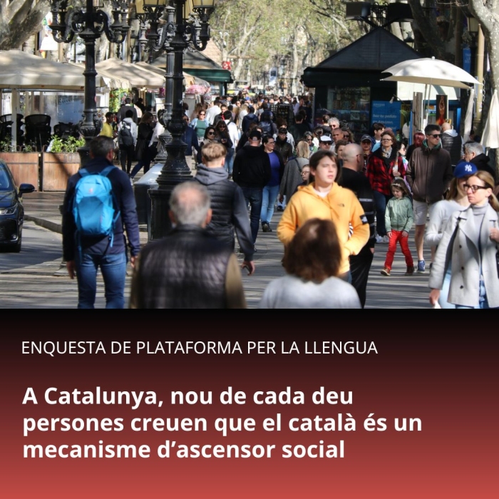 A la societat catalana hi ha un amplíssim consens que el català és una llengua d'ascensor social. Ho apunten dades obtingudes per una enquesta del gabinet estadístic GESOP encarregada per Plataforma per la Llengua. L'estudi, realitzat al juliol, mostra que el 88,7 % dels residents a Catalunya opinen que "aprendre català pot donar més oportunitats laborals, culturals o de millora personal als infants d'origen immigrant". L'enquesta també indica que una majoria àmplia considera que la reducció de l'ús social del català té a veure amb l'augment de persones que no el dominen i, en grau més baix, amb els atacs polítics a la llengua i l'augment de productes audiovisuals en altres llengües. En canvi, només una minoria creu que la reducció sigui conseqüència de la percepció que el català s'imposa, una tesi que difon l'espanyolisme.