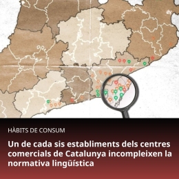 Segons un estudi de Plataforma per la Llengua, el 15,75 % dels locals dels  centres comercials incompleixen el Codi de consum de Catalunya, ja que no tenen la retolació en català