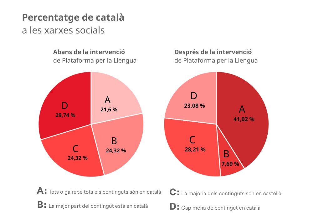 Abans de la intervenció de Plataforma per la Llengua, l'estudi identificava 8 xarxes socials dins la categoria A; 9 dins la B; 10 a la C i 12 a la D. Un cop l'entitat es va posar en contacte amb les gerències dels centres comercials, es va aconseguir augmentar el nombre d'excel·lents (model A) fins als 16. Tot i això, els suficients i els deficients gairebé es mantenien, amb 11 i 9 respectivament. Així doncs, en aquests moments el resum dels 44 centres comercials de Catalunya és el següent: 16 assoleixen la categoria A; 3 la B; 11 la C, i 9 la D. Plataforma per la Llengua continuarà fiscalitzant aquells centres comercials que encara tenen molt marge de millora en aquest sentit per tal de revertir la situació.Creixement constant dels centres comercials