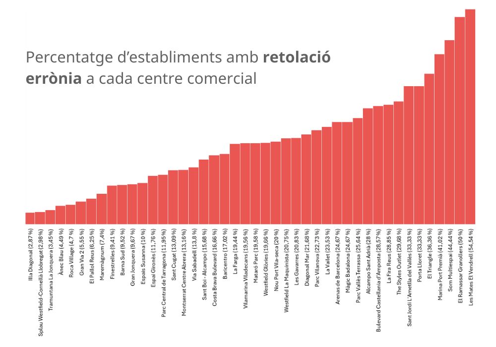 Tot i que no hi hagi cap centre comercial que compti amb tots els establiments correctament senyalitzats, sí que existeixen grans diferències entre alguns d'aquests centres. Per exemple, el centre comercial que més excel·leix és L'Illa Diagonal, perquè solament hi ha un 2,87 % dels locals amb irregularitats en la retolació. En canvi, Les Mates del Vendrell és el que té un pitjor percentatge, amb el 54,54 % d'establiments amb retolació errònia.