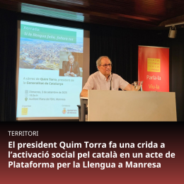 Així, el dimecres 3 de setembre de 2025, a les 19.30 h, davant de les 200 persones que omplien l'auditori Plana de l'Om de Manresa, el president Torra va exposar els seus plantejaments lingüístics en un acte organitzat per Plataforma per la Llengua amb el suport de l'Ajuntament de Manresa, en el qual va recordar que "les llengües només es perden quan es deixen de parlar". Després de la benvinguda del secretari de Plataforma per la Llengua, Francesc Marco, i la presentació de l'acte per part de Josep Maria Fius, en representació del grup local l'entitat a Manresa, Torra va remarcar que després de quatre dècades de polítiques lingüístiques cal "fer les coses diferents" per revertir el descens continuat del percentatge de parlants habituals de català.