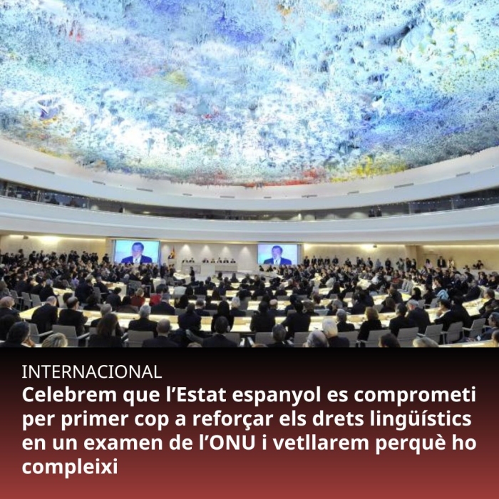 Plataforma per la Llengua celebra que l'Estat espanyol s'hagi compromès, per primera vegada, a reforçar els drets de les comunitats lingüístiques autòctones, en el marc de l'Examen Periòdic Universal (EPU) del Consell de Drets Humans de l'ONU. L'entitat ha estat present en les sessions de l'examen, que han tingut lloc a Ginebra, i insta l'Estat a aplicar sense demora els compromisos. Òscar Escuder, president de Plataforma per la Llengua, intervindrà a Ginebra dilluns, en el marc del debat general, que servirà per tancar aquest cicle d'exàmens, en el qual s'han avaluat una quinzena d'estats.