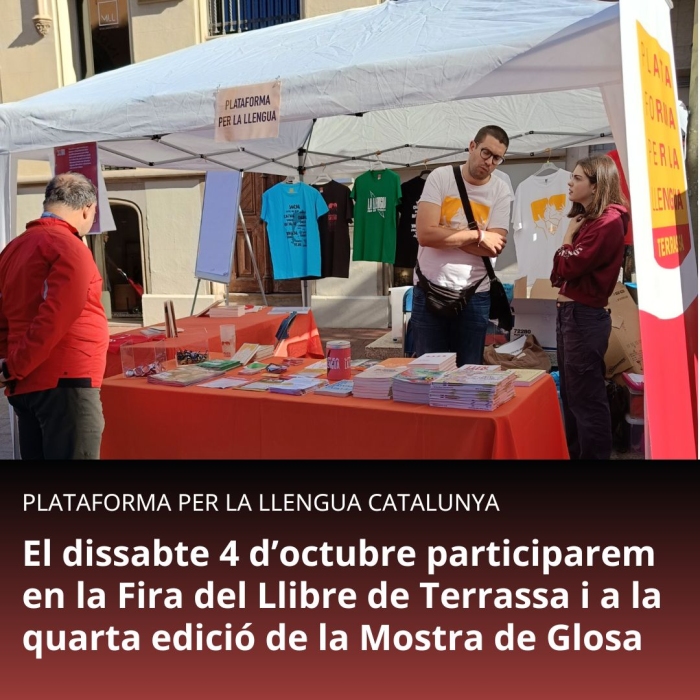 Plataforma per la Llengua participarà el pròxim dissabte 4 d'octubre en la Fira del Llibre de Terrassa 2025 i en la quarta edició de la Mostra de Glosa. L'entitat dona suport a totes dues cites, que faran que la cocapital del Vallès Occidental visqui una jornada marcada per la cultura en català, i hi serà present amb un estand informatiu en què els autors Jordi Martí Monllau, Antoni Gelonch i Òmnia l'Bakkali signaran els seus llibres.