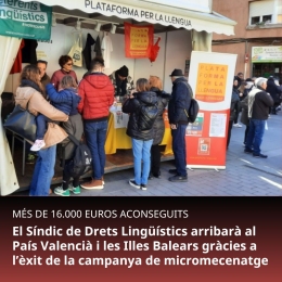 Plataforma per la Llengua farà arribar el Síndic de Drets Lingüístics al País Valencià i les Illes Balears. L'entitat ha aconseguit més de 16.000 euros gràcies a centenars de donants d'arreu del territori en una campanya de micromecenatge que ha superat les expectatives, i que permetrà augmentar la feina en aquests dos territoris per apoderar la ciutadania i que conegui i pugui exercir els seus drets lingüístics. El Síndic és un punt informatiu itinerant que ja funciona a Catalunya i que serveix a l'entitat per acostar arreu del país el servei de defensa de drets lingüístics que ofereix de manera regular de manera telefònica i a través d'un web, ara renovat. Plataforma per la Llengua agraeix a tots els donants la seva generositat i compromís amb la llengua.