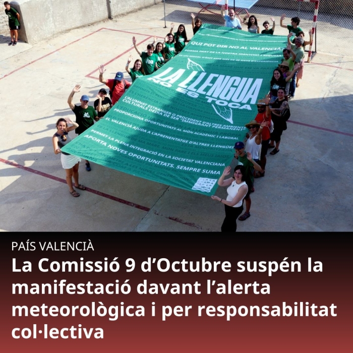 La Comissió 9 d'Octubre, davant les alertes meteorològiques activades per l'AEMET per fort temporal i risc de pluges intenses i vent, ha decidit suspendre la manifestació prevista per al 9 d'Octubre. Plataforma per la Llengua és una de les entitats que forma part de la Comissió 9 d'Octubre, al costat d'Acció Cultural del País Valencià (ACPV), ACV Tirant lo Blanc, Bloc de l'Estudiantat Agermanat (BEA), Ca Revolta, CCOO-PV, Compromís, Decidim, Intersindical Valenciana, Esquerra Republicana del País Valencià (ERPV), Esquerra Unida del País Valencià (EUPV), Escola Valenciana, Podem i la Societat Coral el Micalet,