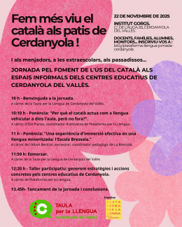 La preocupació per la visible pèrdua de presència del català en els espais més espontanis i informals dels centres educatius: els patis, els menjadors o les activitats extraescolars ha motivat a la Taula per la Llengua de Cerdanyola i Plataforma per la Llengua a impulsar una jornada oberta a tota la comunitat educativa de Cerdanyola del Vallès per reflexionar i actuar sobre els usos del català més enllà de les aules.
