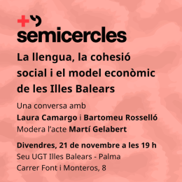 Plataforma per la Llengua organitza el divendres 21 de novembre un col·loqui a Palma sobre l'impacte que ha tengut el model econòmic turístic de les Illes Balears en la salut del català. El seminari, que es farà a la seu de la UGT (carrer de Font i Monteros, 8), és el darrer dels debats de Més Semicercles d'aquest 2025, i també explorarà la relació entre la llengua pròpia, la cohesió social i el progrés personal. L'acte començarà a les 19 h i comptarà amb la intervenció de Laura Camargo, professora de lingüística a la UIB, i Bartomeu Rosselló, president del Cercle Mallorquí de Negocis. La moderació del seminari, que ha comptat amb la col·laboració de l'Institut d'Estudis Baleàrics, serà a càrrec del periodista Martí Gelabert.