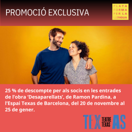 2 - Entris a DESAPARELLATS ' Sessions ' Espai Texas i compris les entrades per a les funcions del 20 de novembre al 25 de gener del 2026. Abans de fer-ne el pagament final, recorda afegir, a la zona «Tens un codi promocional?» el codi que t'haurem facilitat.