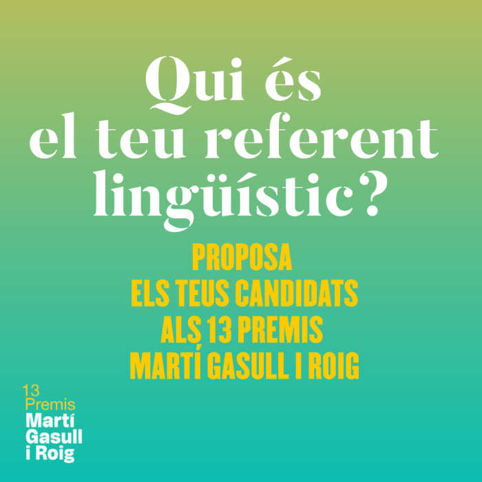 A partir d'avui ja es poden proposar els candidats a guanyar el Premi Martí Gasull i Roig -dotat amb 3.000 euros- que guardona persones, entitats o empreses que s'hagin distingit per la defensa o promoció de la llengua, i i per primera vegada se'n poden proposar també per al Premi a la Innovació -dotat amb 2.000 euros-, que reconeix projectes transformadors que suposin un revulsiu per a la llengua catalana en el context actual. Es poden enviar les propostes de candidats fins al dimarts 16 de desembre a la nit.