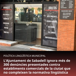 L'Ajuntament de Sabadell ha ignorat més de 300 denúncies presentades contra establiments comercials de la cocapital del Vallès Occidental que no compleixen la normativa en matèria lingüística. El grup local de Sabadell de Plataforma per la Llengua ha coordinat el registre de les queixes contra negocis com ara bars, restaurants, cafeteries i altres comerços de la ciutat pels incompliments de la normativa sobre l'ús del català en la retolació, les cartes i la informació visible al públic. A més, 100 d'aquestes denúncies també s'han presentat a l'Agència Catalana del Consum, amb la finalitat que s'iniciïn les actuacions corresponents i es garanteixi el compliment efectiu de la legislació vigent.