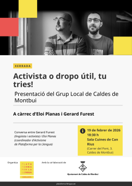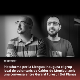 Plataforma per la Llengua posa en marxa un nou grup local de voluntaris a Caldes de Montbui, una iniciativa que pretén fer créixer l'activisme lingüístic i consolidar espais de trobada per promoure l'ús social del català a la vida comunitària i els àmbits quotidians. La presentació oficial del grup local tindrà lloc dijous 19 de febrer, a les 18:30h, a la Sala Cuines de Can Rius de Caldes de Montbui. L'acte es basarà en una conversa entre el filòleg i activista Gerard Furest i el coordinador d'Activisme de Plataforma per la Llengua, Eloi Planas, acompanyats pels membres del nou grup local, que abordarà reptes, oportunitats i estratègies per reforçar la presència del català en tots els àmbits socials i culturals.