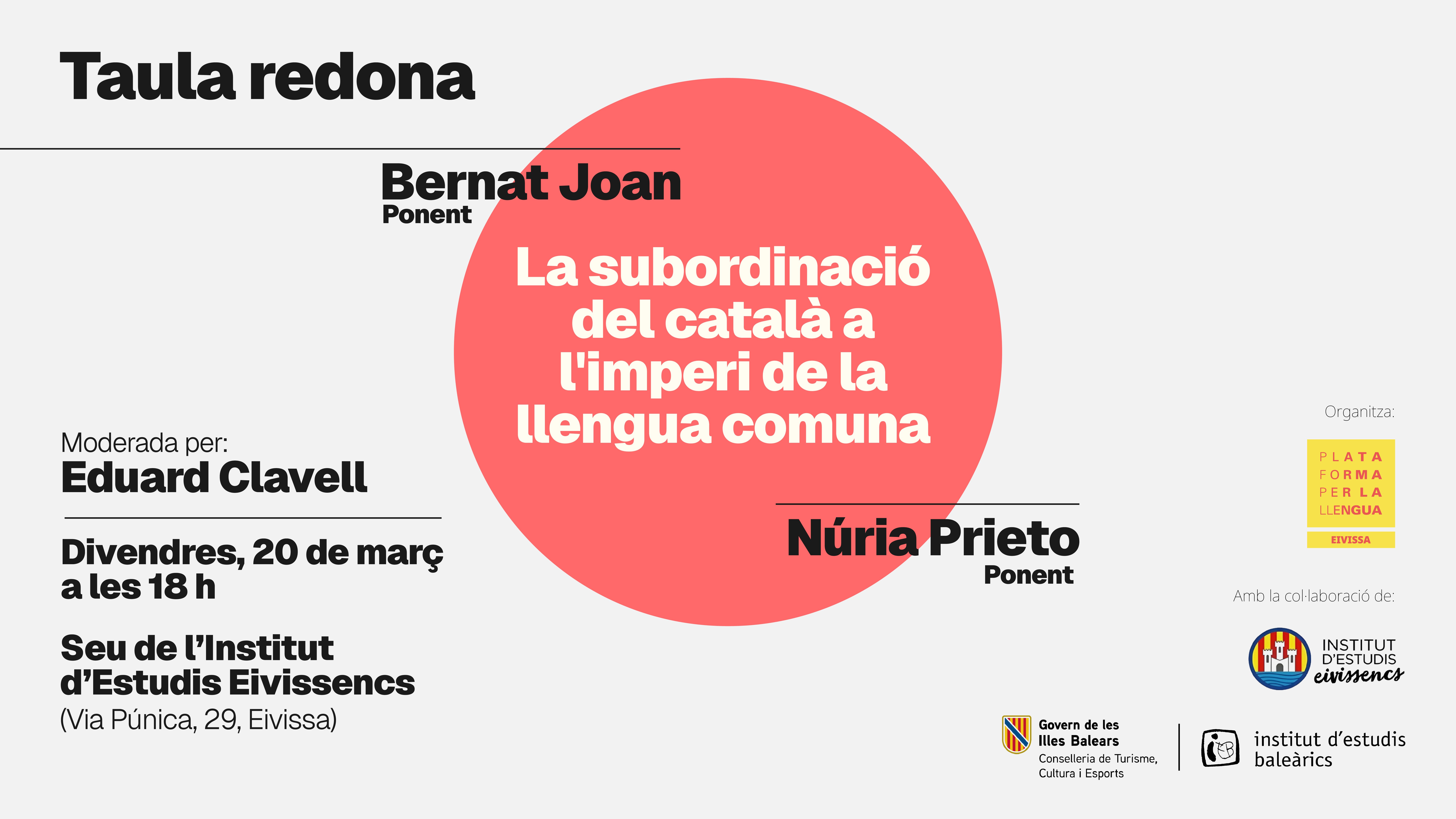 Plataforma per la Llengua organitza el pròxim divendres, 20 de març, la taula redona "La subordinació del català a l'imperi de la llengua comuna", una reflexió i debat sobre les lògiques polítiques i socials que han situat el català en una posició de subordinació dins l'Estat espanyol. Els ponents seran la mestra i portaveu sindical de l'STEI Pitiüses, Núria Prieto, i el sociolingüista i assagista Bernat Joan. L'acte es durà a terme a la seu de l'Institut d'Estudis Eivissencs (IEE), a la ciutat d'Eivissa (Via Púnica, 29) a les 18 h. L'IEE i l'Institut d'Estudis Baleàrics (IEB) donen suport a l'organització de l'esdeveniment.