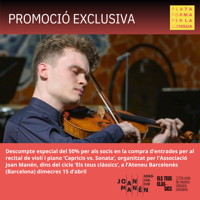 Si ets soci de Plataforma per la Llengua i vols beneficiar-te del preu especial amb descompte en la compra d'entrades per a aquest recital (10 € per entrada), envia un correu electrònic a promocions@plataforma-llengua.cat o truca al telèfon 93 321 18 03 i et facilitarem el codi promocional que cal afegir en comprar les entrades, seguint aquest enllaç: Caprici vs. sonata ' Ticketing.