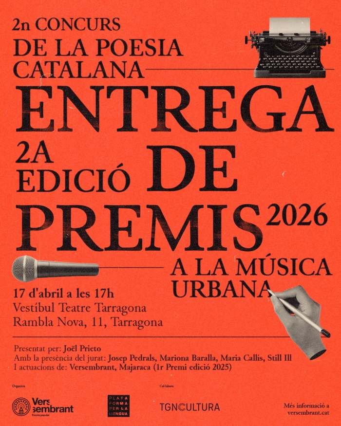 Plataforma per la Llengua i la cooperativa educativa Versembrant celebraran el pròxim divendres 17 d'abril a les 17 h el lliurament de premis de la segona edició del concurs "De la poesia catalana a la música urbana" al Vestíbul del Teatre Tarragona (Rambla Nova, 11, Tarragona). La gala compta amb el suport de Litterarum, la fira d'espectacles literaris de Móra d'Ebre, i la col·laboració de TGN Cultura.