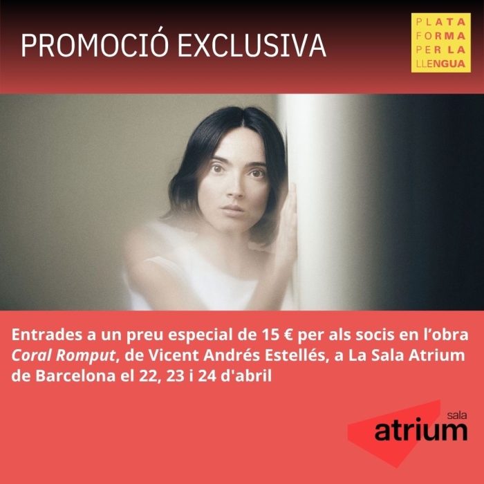 La Sala Atrium ofereix als socis de Plataforma per la Llengua un preu especial de 15 € per a l'obra Coral Romput, de Vicent Andrés Estellés, que torna a Barcelona en 3 úniques funcions el 22, 23 i 24 d'abril
