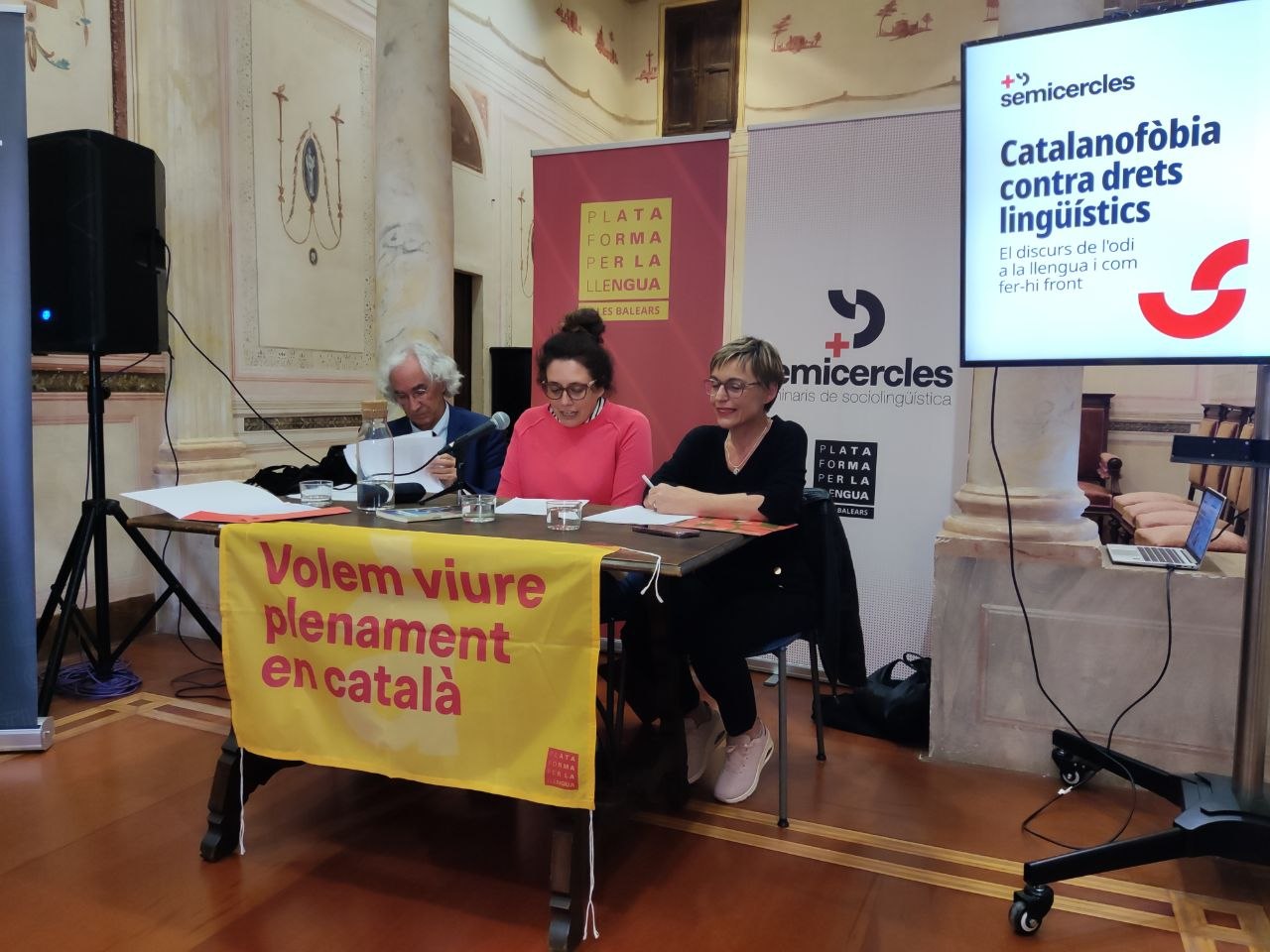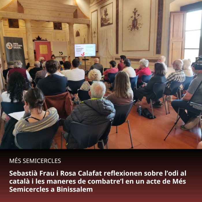 El passat divendres 17 d'abril el Casal de Cultura Can Gelabert de Binissalem acollí el primer acte del cicle de col·loquis de Més Semicercles de 2026. El d'enguany està dedicat a la catalanofòbia, a l'odi a la llengua catalana i a la seva centralitat en el panorama polític de l'Estat espanyol. La voluntat és entendre aquest fenomen, estendre la consciència lingüística i promoure marcs i estratègies per avançar cap a la normalització del català.
